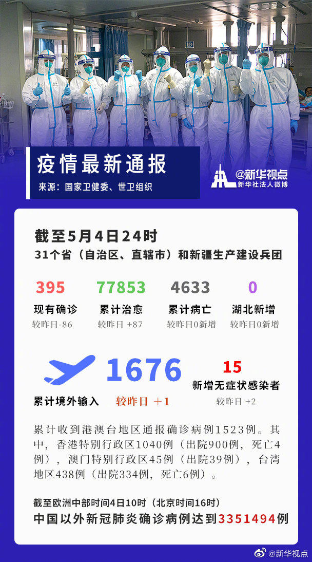 新華社北京5月5日電(記者王秉陽)國家衛健委5日通報,5月4日0-24時,31個省(自治區、直轄市)和新疆生產建設兵團報告新增確診病例1例,為境外輸入病例(在上海);無新增死亡病例;無新增疑似病例。