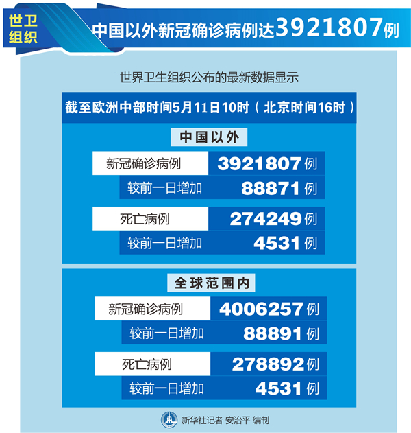 新華社日內瓦5月11日電(記者劉曲)世界衛生組織11日公布的最新數據顯示,中國以外新冠確診病例達到3921807例。