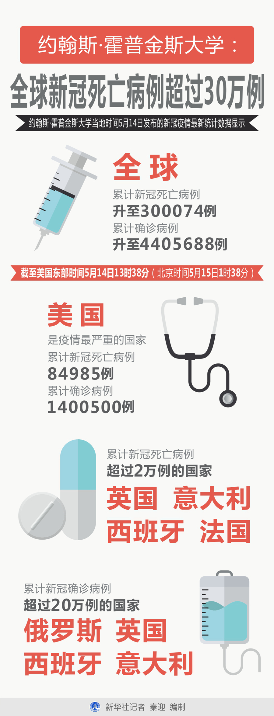 新華社紐約5月14日電 美國約翰斯·霍普金斯大學14日發(fā)布的新冠疫情最新統(tǒng)計數據顯示,全球累計新冠死亡病例超過30萬例。