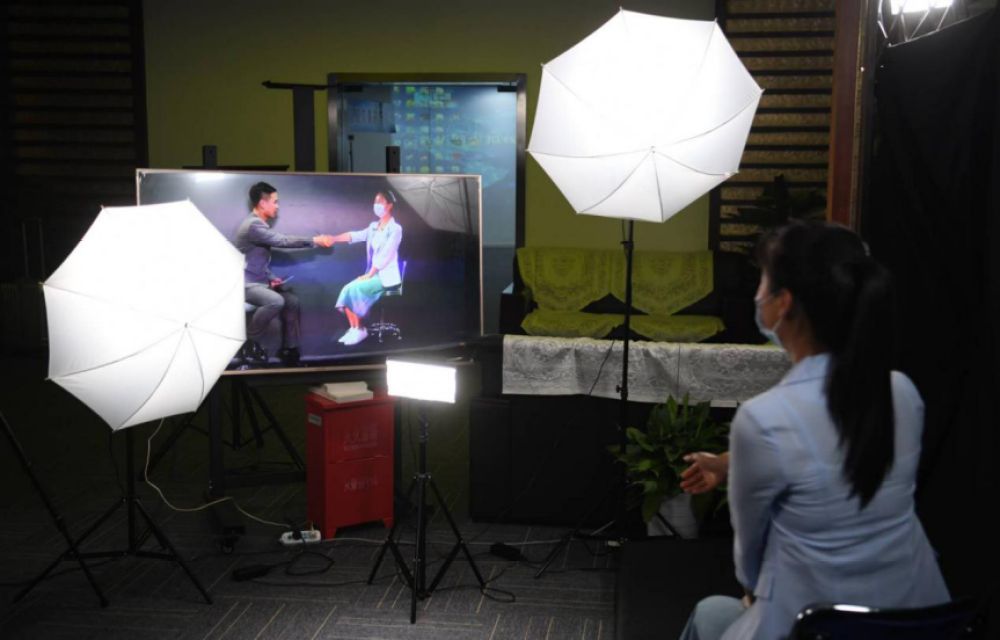 ↑本場訪談是新華社首次采用5G傳輸加全息成像技術(shù)進(jìn)行采訪,使全國人大代表和主持人即使相隔千里也能實(shí)現(xiàn)“面對(duì)面”的交流。這是全國人大代表程桔在武漢演播室伸手,與北京的主持人高熹“云握手”。新華社記者 程敏 攝