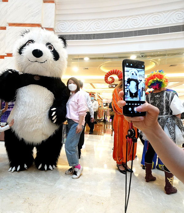 5月5日,顧客在上海環球港商場與大熊貓人偶合影 陳飛攝