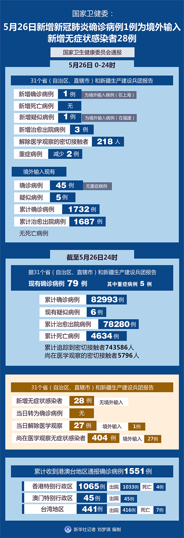 截至5月26日24時,據31個省(自治區、直轄市)和新疆生產建設兵團報告,現有確診病例79例(其中重癥病例5例),累計治愈出院病例78280例,累計死亡病例4634例,累計報告確診病例82993例,現有疑似病例6例。累計追蹤到密切接觸者743586人,尚在醫學觀察的密切接觸者5796人。