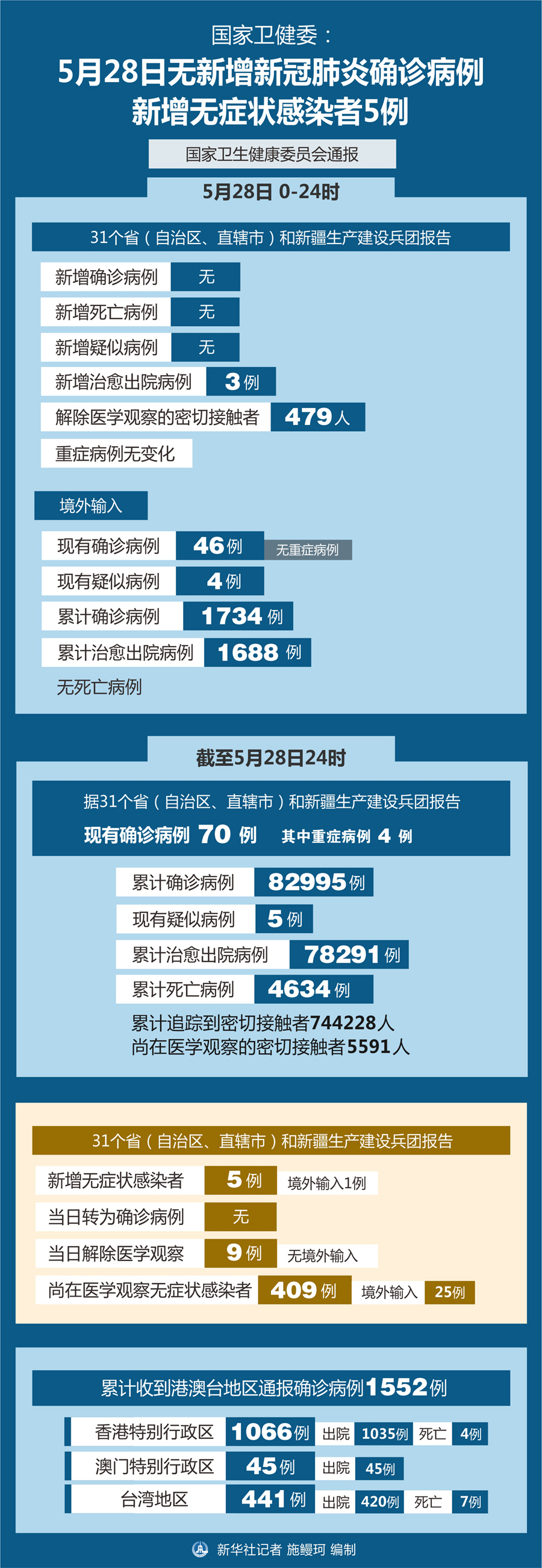 新華社北京5月29日電 國家衛健委29日通報,5月28日0—24時,31個省(自治區、直轄市)和新疆生產建設兵團報告無新增新冠肺炎確診病例;無新增死亡病例;無新增疑似病例;新增無癥狀感染者5例。