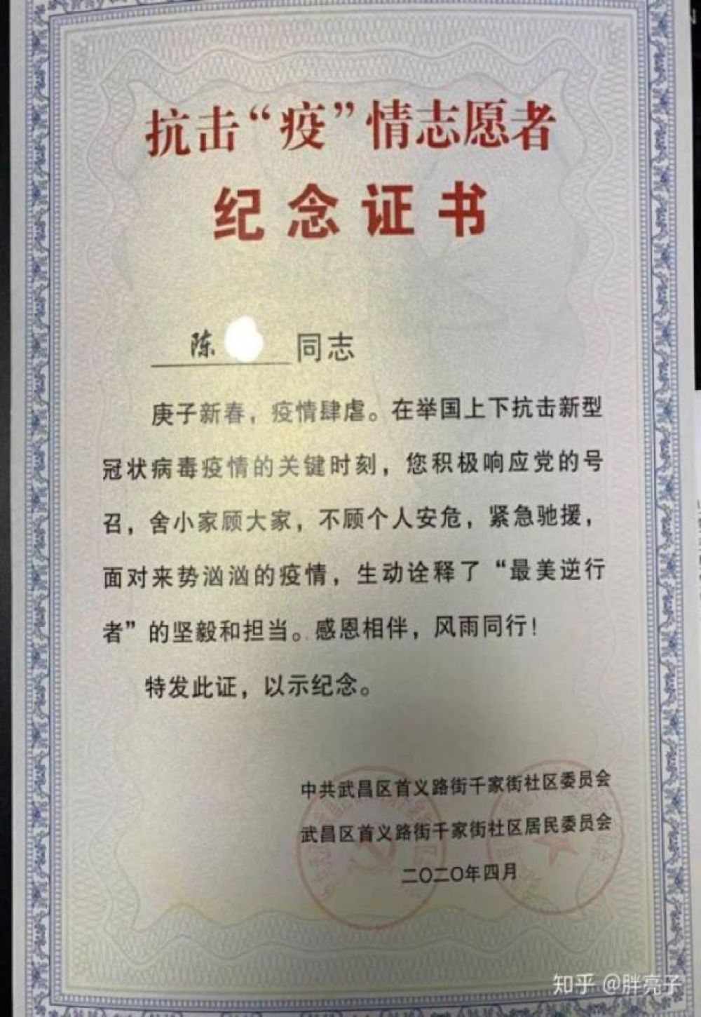 在武漢,網友“胖亮子”說,2月底,他的妻子接到下沉社區做志愿者的通知,可以自愿選擇,但她很快答應了。“平時有點潔癖而且膽小的老婆在這個時候能夠挺身而出,讓我刮目相看。”