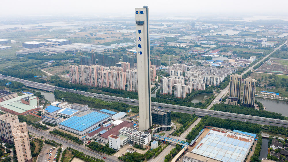 這是5月28日拍攝的江蘇蘇州市吳江區汾湖高新區的康力電梯試驗塔(無人機照片)。新華社記者 李博 攝