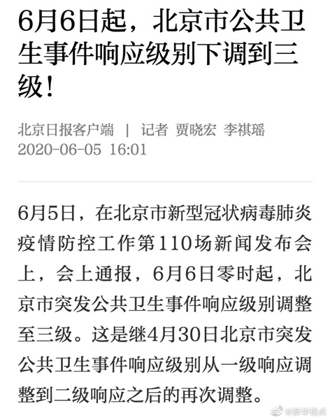 6月5日,在北京市新型冠狀病毒肺炎疫情防控工作第110場新聞發(fā)布會上,會上通報,6月6日零時起,北京市突發(fā)公共衛(wèi)生事件響應(yīng)級別調(diào)整至三級。這是繼4月30日北京市突發(fā)公共衛(wèi)生事件響應(yīng)級別從一級響應(yīng)調(diào)整到二級響應(yīng)之后的再次調(diào)整。?