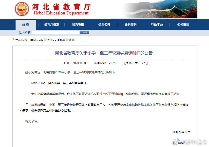 記者9日從河北省教育廳獲悉,河北省6月15日起全省小學一至三年級復學復課。復學復課前,小學一至三年級繼續開展線上教育教學工作。河北省教育廳要求各地要嚴格落實疫情防控常態化條件下復學復課各項防控措施和要求,確保校園安全和師生身心健康。大中小學全部復學復課后,合法線下教育培訓機構可提出線下開班申請,核驗合格,履行程序后有序恢復線下培訓。(記者李繼偉)