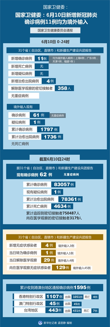 新華社北京6月11日電(記者陳聰)據國家衛生健康委員會11日通報,6月10日0-24時,31個省(自治區、直轄市)和新疆生產建設兵團報告新增新冠肺炎確診病例11例,均為境外輸入病例(上海6例,廣東3例,天津1例,福建1例);無新增死亡病例;無新增疑似病例。