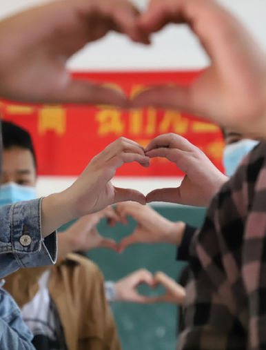 學(xué)生手比心形,感謝母親 馬玉 攝