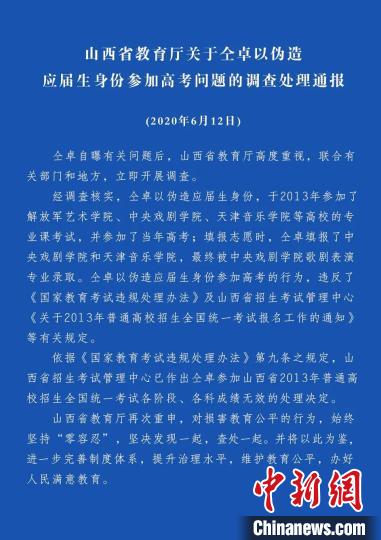 經調查核實,仝卓以偽造應屆生身份,于2013年參加解放軍藝術學院、中央戲劇學院、天津音樂學院等高校的專業課考試,并參加當年高考,被中央戲劇學院歌劇表演專業錄取。依據《國家教育考試違規處理辦法》第九條之規定,山西省招生考試管理中心作出仝卓參加山西省2013年普通高校招生全國統一考試各階段、各科成績無效的處理決定。