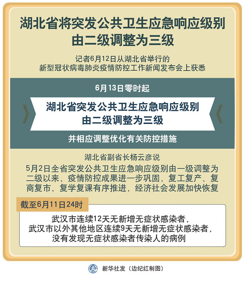 新華社武漢6月12日電(記者李偉、樂文婉)記者12日從湖北省舉行的新型冠狀病毒肺炎疫情防控工作新聞發布會上獲悉,6月13日零時起,湖北省突發公共衛生應急響應級別由二級調整為三級,并相應調整優化有關防控措施。