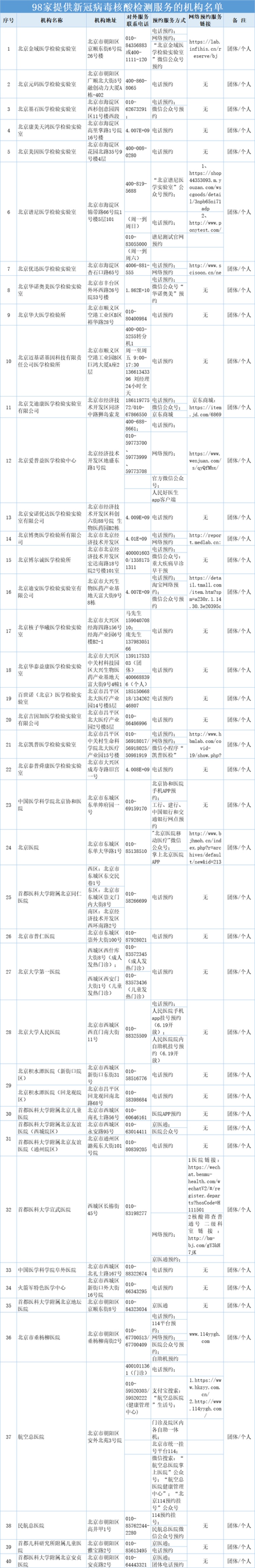 2020年4月15日、5月11日,我市分別公布了46所和21所,面向團體和個人提供新冠病毒核酸檢測服務的醫療衛生機構。截至6月13日,我市又新增31家具備核酸檢測能力的醫療衛生機構,可面向團體和個人提供新冠病毒核酸檢測服務。目前我市具備核酸檢測能力的機構達到98所,每天最大檢測能力已達9萬多人。根據防控工作需要,為便于群眾預約查詢,我委匯總了檢測機構的網絡預約鏈接和APP、微信公眾號等信息。現將面向社會團體和個人提供新冠病毒核酸檢測服務的98所醫療衛生機構名單予以公布,有檢測需求的單位和個人,請提前進行預約。