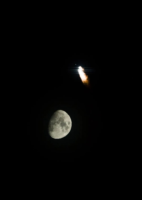 2015年3月30日,搭載首顆新一代北斗導航衛星的長征三號丙運載火箭在西昌衛星發射中心點火發射,火箭升空后與明月交相輝映。新華社記者 白禹 攝