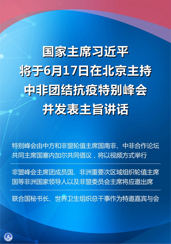 特別峰會由中方和非盟輪值主席國南非、中非合作論壇共同主席國塞內加爾共同倡議,將以視頻方式舉行。非盟峰會主席團成員國、非洲重要次區域組織輪值主席國等非洲國家領導人以及非盟委員會主席將應邀出席。聯合國秘書長、世界衛生組織總干事作為特邀嘉賓與會。