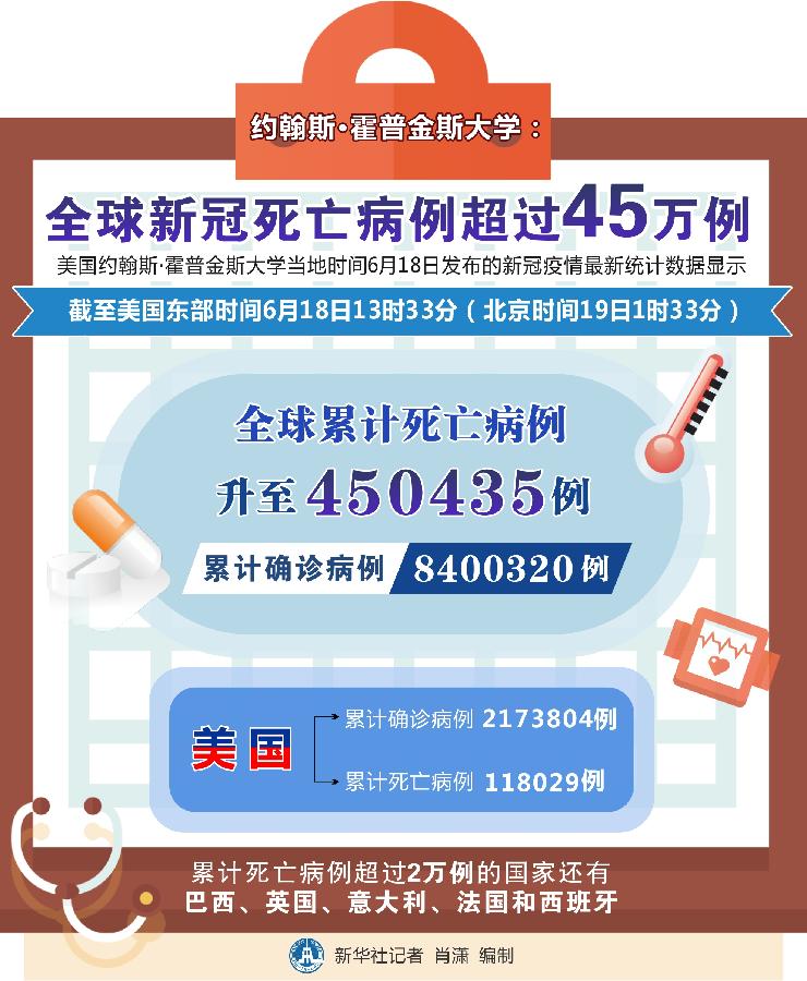 新華社紐約6月18日電 美國約翰斯·霍普金斯大學(xué)18日發(fā)布的新冠疫情最新統(tǒng)計(jì)數(shù)據(jù)顯示,全球累計(jì)死亡病例超過45萬例。