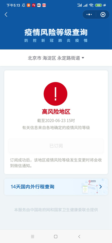北京又增一個高風險地區! 記者從國務院客戶端小程序“疫情風險等級查詢”上了解到,截至6月23日15時,北京市海淀區永定路街道由中風險調整為高風險。