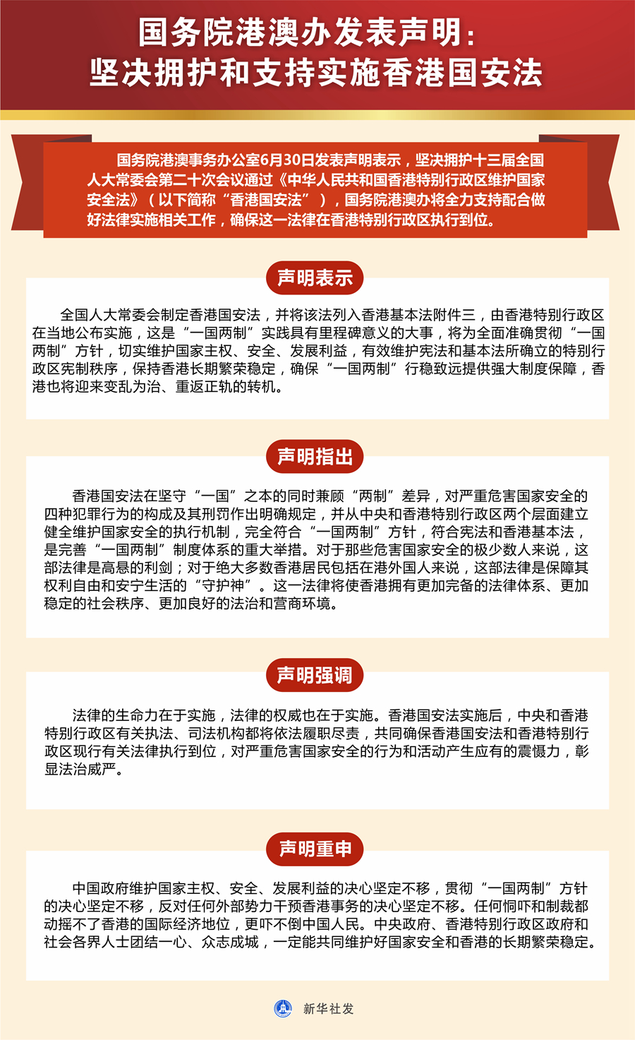 新華社北京6月30日電 國務院港澳事務辦公室30日發表聲明表示,堅決擁護十三屆全國人大常委會第二十次會議通過《中華人民共和國香港特別行政區維護國家安全法》(以下簡稱“香港國安法”),國務院港澳辦將全力支持配合做好法律實施相關工作,確保這一法律在香港特別行政區執行到位。
