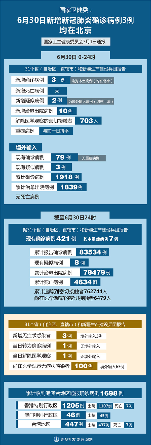 新華社北京7月1日電(記者胡喆)國家衛生健康委員會7月1日通報,6月30日0-24時,31個省(自治區、直轄市)和新疆生產建設兵團報告新增確診病例3例,均為本土病例(均在北京);無新增死亡病例;新增疑似病例2例,為境外輸入病例(均在上海)。