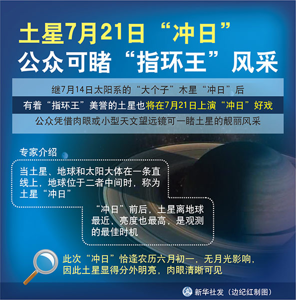新華社天津7月19日電(記者周潤健)繼7月14日太陽系的“大個子”木星“沖日”后,有著“指環王”美譽的土星也將在7月21日上演“沖日”好戲,公眾憑借肉眼或小型天文望遠鏡可一睹土星的靚麗風采。