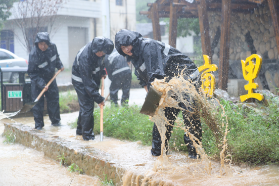 2020年7月6日,浙江省湖州市德清縣武康街道對河口村,青年黨員搶險救援隊隊員正在用鐵鍬排水。人民圖片 王正/攝