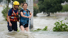 7月14日,鄭國花(左)用繩子拉著鄭龍進行訓練。新華社記者 連振 攝