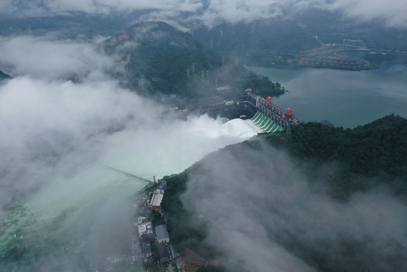 7月8日,新安江水庫開啟9孔泄洪(無人機(jī)照片)。新華社發(fā)(李忠 攝)
