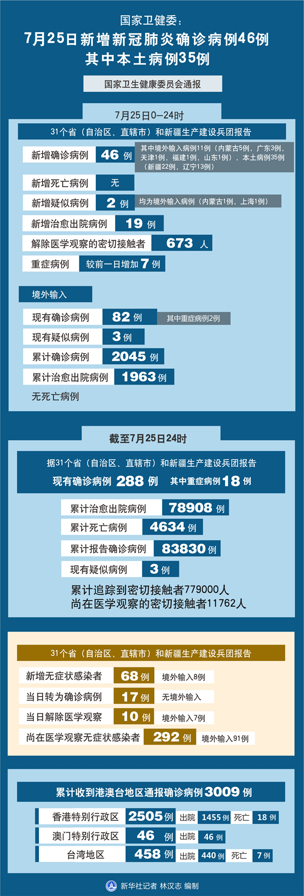 新華社北京7月26日電 國家衛生健康委員會26日通報,7月25日0-24時,31個省(自治區、直轄市)和新疆生產建設兵團報告新增新冠肺炎確診病例46例,其中境外輸入病例11例(內蒙古5例,廣東3例,天津1例,福建1例,山東1例),本土病例35例(新疆22例,遼寧13例);無新增死亡病例;新增疑似病例2例,均為境外輸入病例(內蒙古1例,上海1例)。