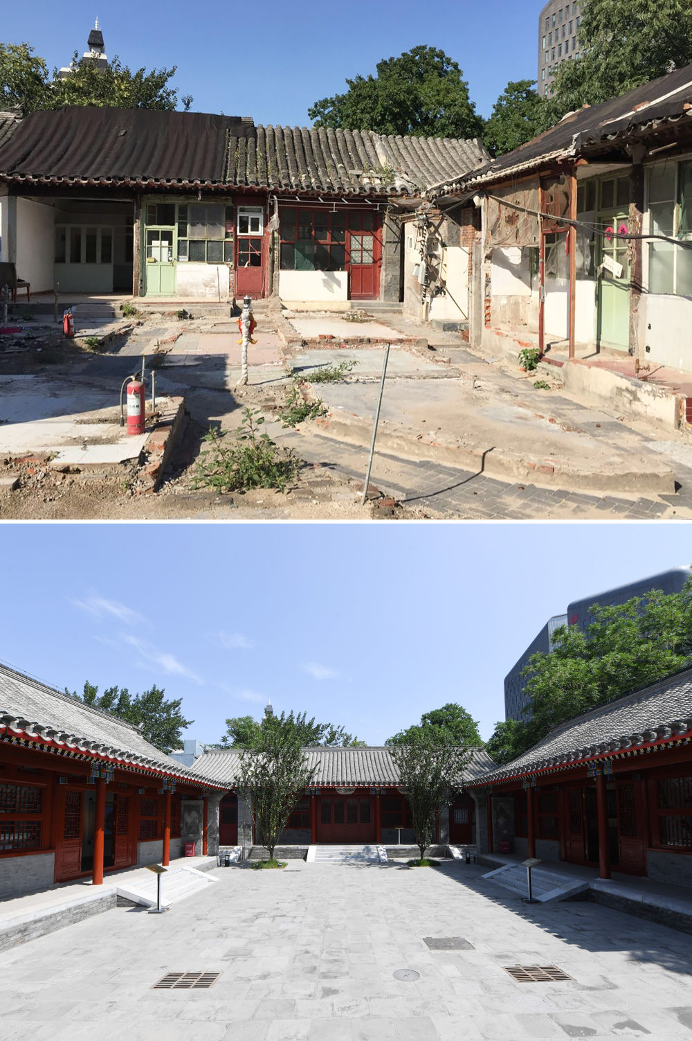 這是一張拼版照片,上圖為:騰退修繕中的沈家本故居(資料照片);下圖為:6月10日拍攝的沈家本故居(新華社記者鞠煥宗攝)。新華社發