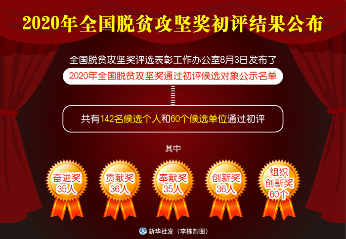 新華社北京8月3日電(記者侯雪靜)全國(guó)脫貧攻堅(jiān)獎(jiǎng)評(píng)選表彰工作辦公室3日發(fā)布了2020年全國(guó)脫貧攻堅(jiān)獎(jiǎng)通過(guò)初評(píng)候選對(duì)象公示名單,共有142名候選個(gè)人和60個(gè)候選單位通過(guò)初評(píng),其中奮進(jìn)獎(jiǎng)有35人,貢獻(xiàn)獎(jiǎng)36人,奉獻(xiàn)獎(jiǎng)35人,創(chuàng)新獎(jiǎng)36人,組織創(chuàng)新獎(jiǎng)60個(gè)。