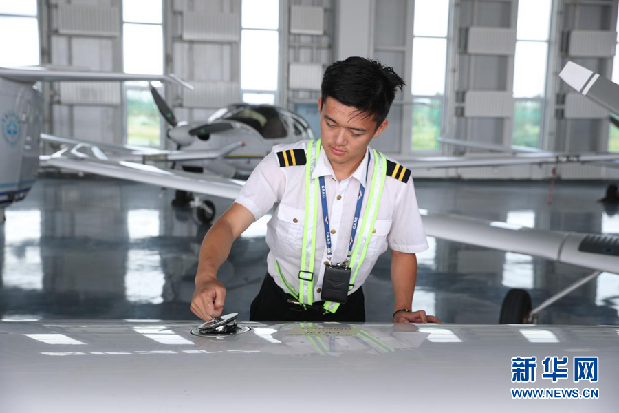 圖為8月6日,內蒙古飛行學院飛行學員在起飛前檢查航油情況。新華網記者焦鵬 攝