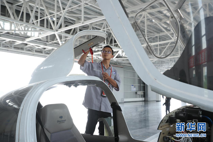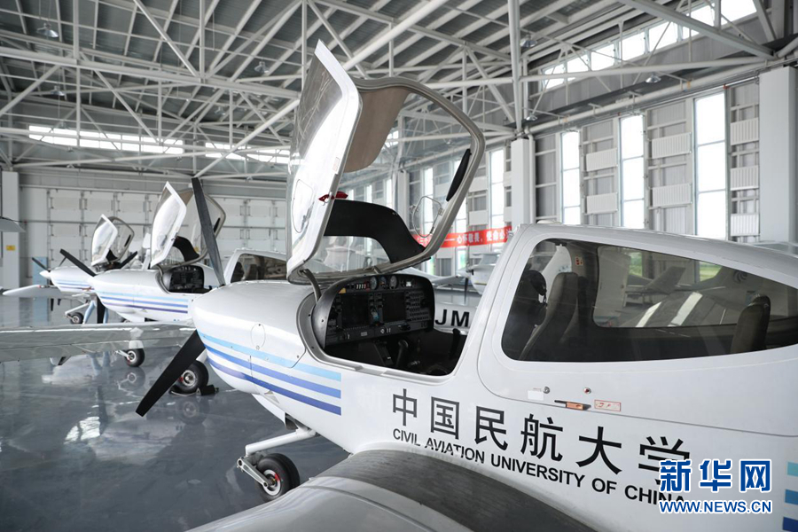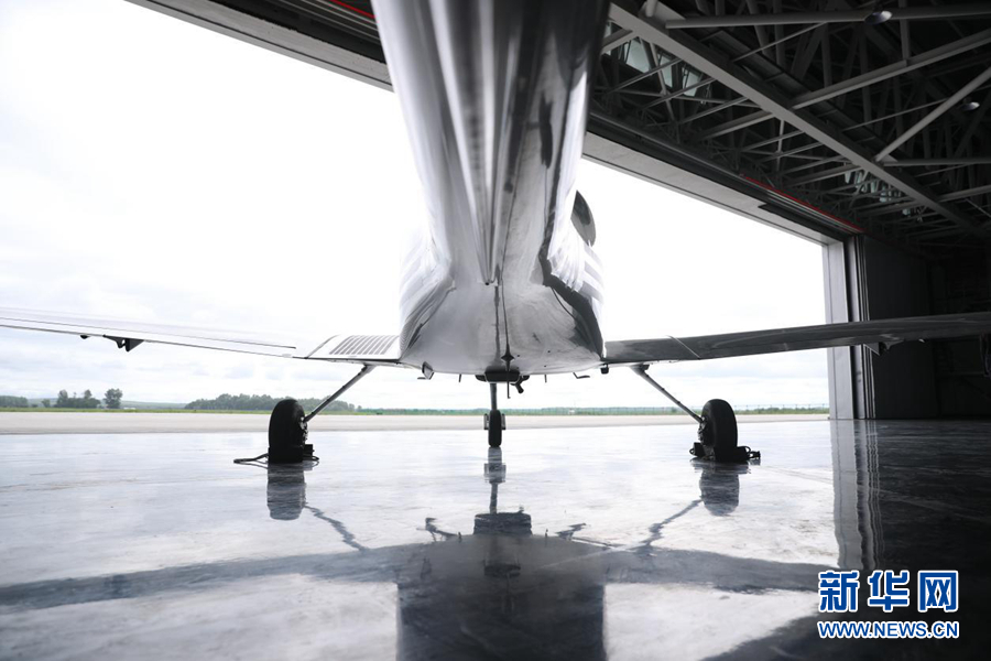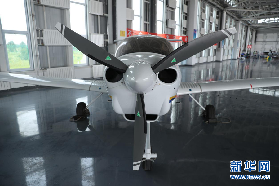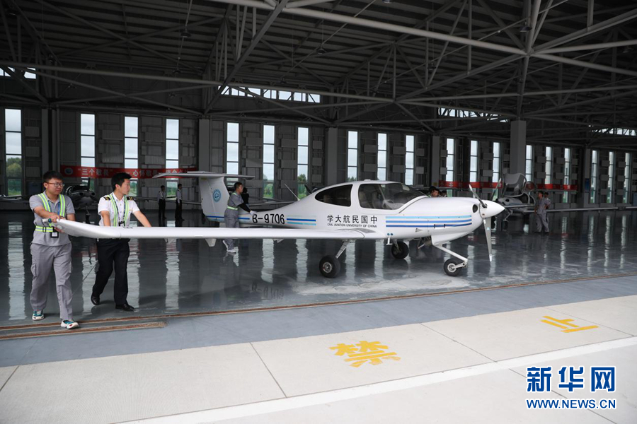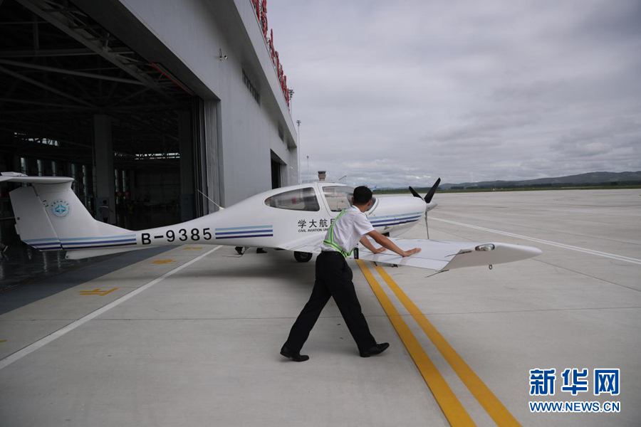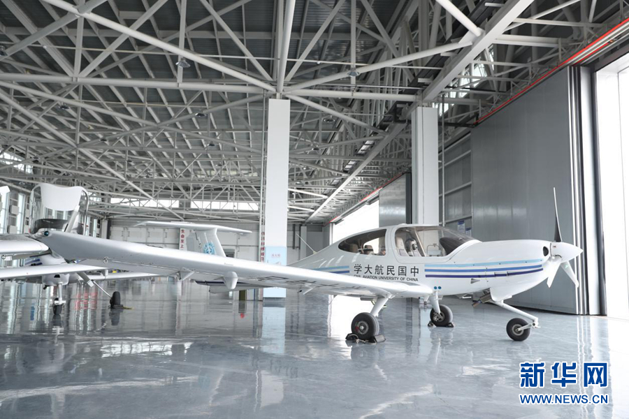 圖為中國民航大學內蒙古飛行學院機庫中待飛的單發DA40D飛機。新華網記者焦鵬 攝