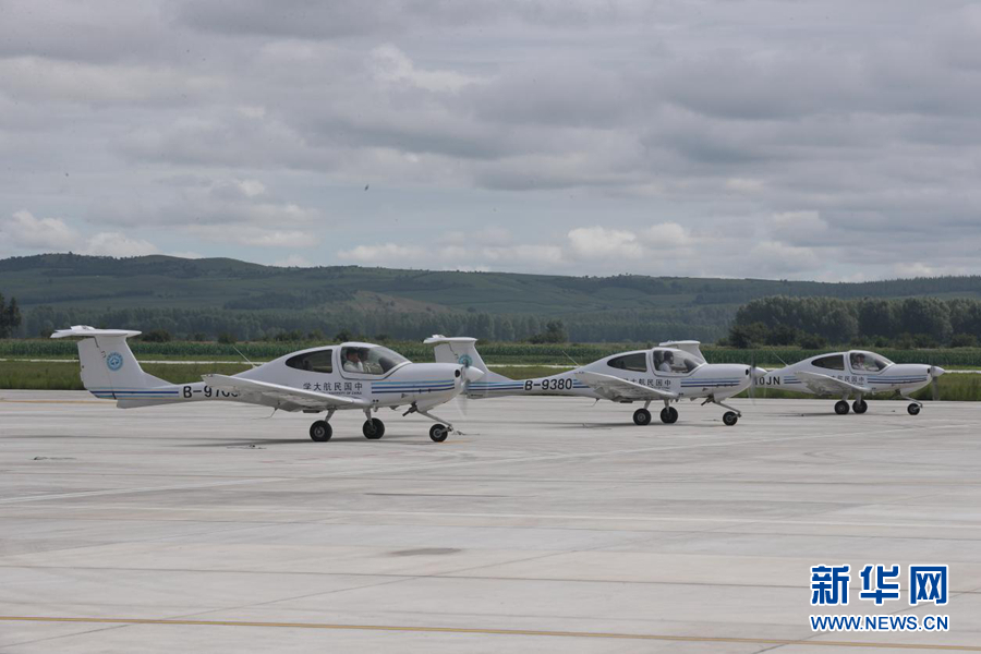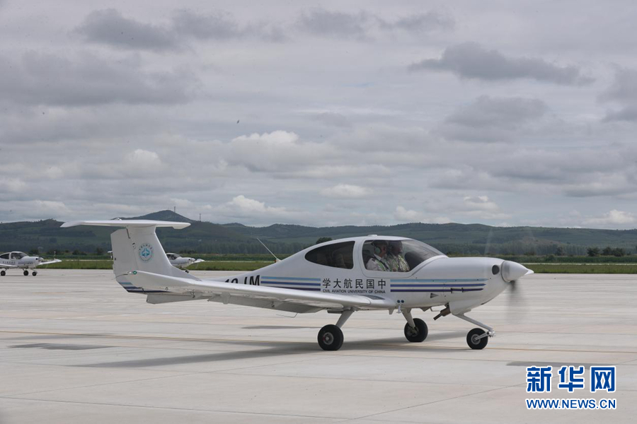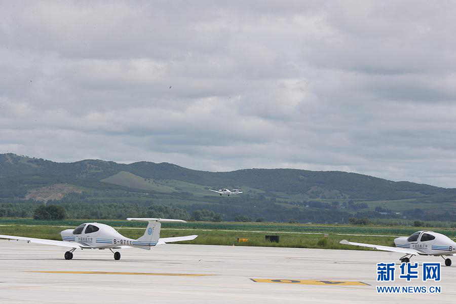 圖為飛行學員駕駛訓練機從扎蘭屯成吉思汗機場起飛。新華網記者焦鵬 攝