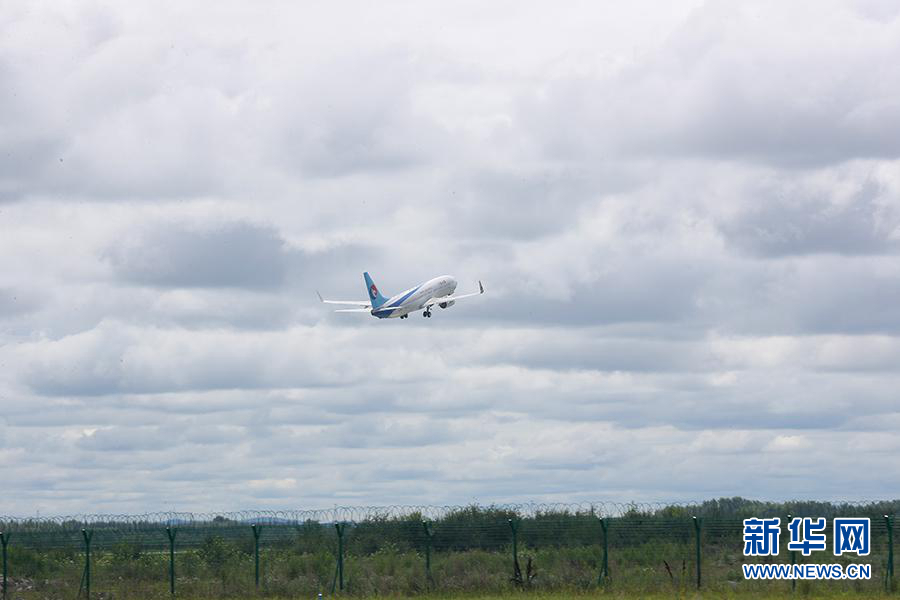 圖為8月6日在扎蘭屯成吉思汗機場起飛的河北航空公司波音737-800客機。新華網記者焦鵬 攝