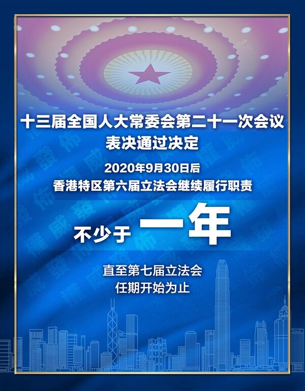 第十三屆全國人民代表大會常務委員會第二十一次會議審議了《國務院關于提請全國人民代表大會常務委員會就香港特別行政區第六屆立法會繼續運作作出決定的議案》。上述議案是應香港特別行政區行政長官向中央人民政府報送的有關報告提出的。香港特別行政區行政長官會同行政會議因應當地新冠肺炎疫情的嚴峻形勢已決定將香港特別行政區第七屆立法會選舉推遲一年,在此情況下香港特別行政區立法機關將出現空缺。為維護香港特別行政區憲制秩序和法治秩序,確保香港特別行政區政府正常施政和社會正常運行,根據《中華人民共和國憲法》和《中華人民共和國香港特別行政區基本法》的有關規定,全國人民代表大會常務委員會作出如下決定: