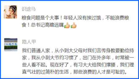 吃飯人人會,但怎么吃卻見境界。早在2013年,總書記在闡述糧食安全戰(zhàn)略時就告誡人們,“要牢記歷史,在吃飯問題上不能得健忘癥,不能好了傷疤忘了疼”。這次,總書記又強調(diào),“盡管我國糧食生產(chǎn)連年豐收,對糧食安全還是始終要有危機意識”。對此,很多網(wǎng)友深表贊同,認(rèn)為這些指示要言不煩、直指要害,我們決不能忘記餓肚子的歲月!