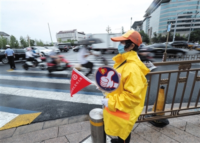 8月13日,西單路口,文明引導(dǎo)員在雨中維護(hù)路口秩序。新京報(bào)記者 王貴彬 攝