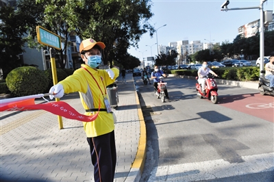 8月13日,馬家堡西路文明引導(dǎo)員在疏導(dǎo)交通。新京報(bào)記者 吳寧 攝