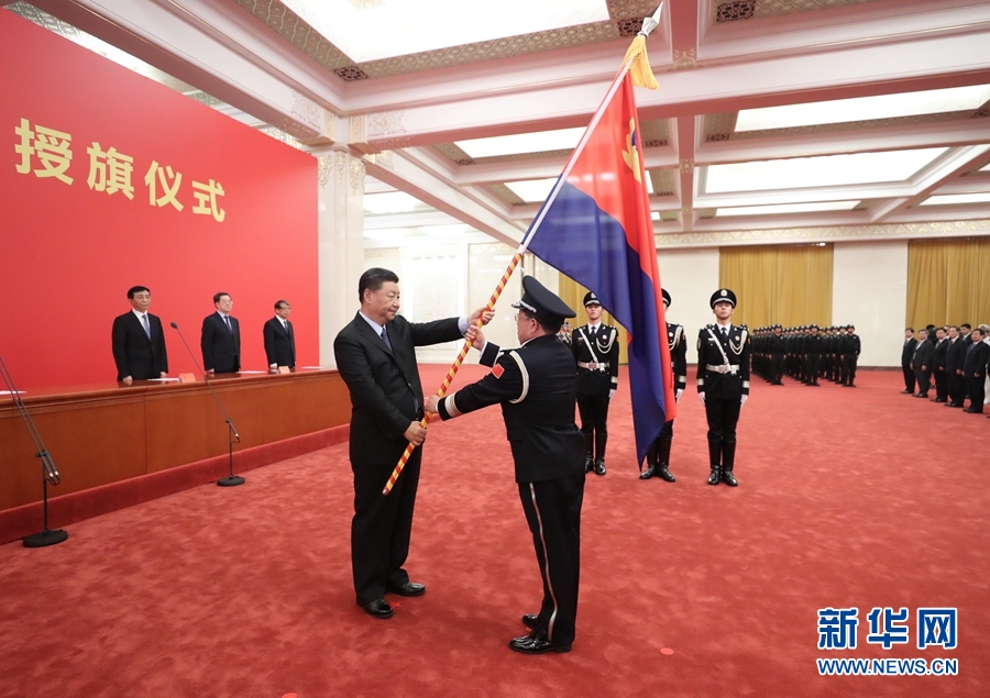 儀仗隊員護衛著中國人民警察警旗,正步行進到主席臺前。習近平分別向公安部部長、總警監趙克志,國家安全部部長、總警監陳文清授旗。趙克志、陳文清向習近平敬禮,從習近平手中接過中國人民警察警旗,面向全場展旗。全場人民警察向警旗莊嚴敬禮。