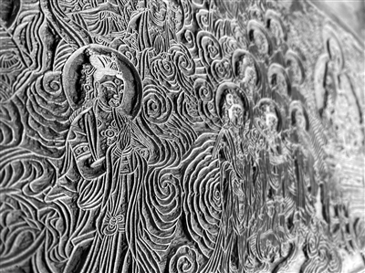 隨著白富鋼的五指輕盈地在古老的木板上游走,一塊木質經板上縱橫的紋理逐漸明晰起來。這批經板始刻于清雍正十一年(公元1733年),完成于清乾隆三年(公元1738年),是我國漢文大藏經卷帙中收錄最豐富,也是最后一部官方雕印本。經板共計79036塊,總重達400噸??胺Q我國木板經書之最。
