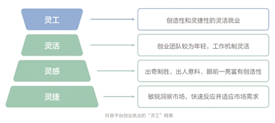 抖音就業(yè)人員規(guī)模龐大、類型多樣、形態(tài)各異。《報告》認為,其就業(yè)特色可以用“靈工”來概括,即具有靈活、靈氣和靈捷的特征,更強調多元化和創(chuàng)造力,不同于共享經(jīng)濟平臺和傳統(tǒng)“零工”就業(yè)特征。