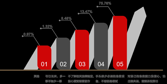 廉思課題組的報告顯示,缺乏急救知識是大學生不愿參與現場急救的原因之一。當遇到呼吸停止的無意識人員時,68.33%的被調查者選擇“撥打120,并在原地等候”,能“立即上前查看,并采取急救措施”的只有25.76%。