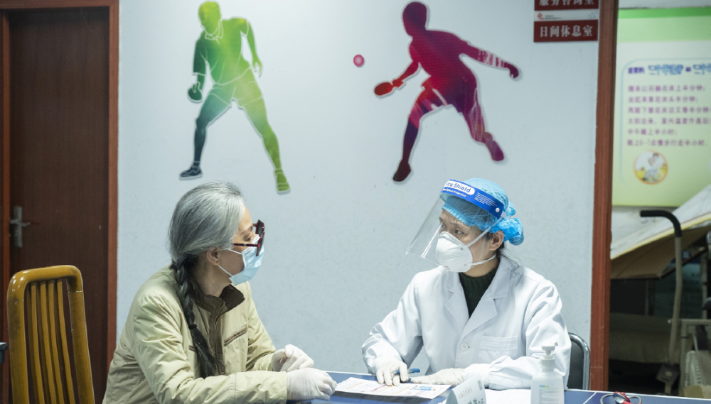 4月14日,在武漢市江岸區花橋街花橋社區居家養老服務中心,武漢亞洲心臟病醫院醫護人員在為社區老人義診 (才揚/攝)
