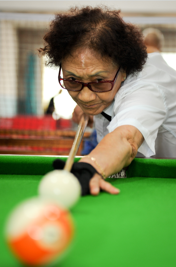 長春市春城街道活動中心老人馮化庚在該中心臺球培訓班做示范