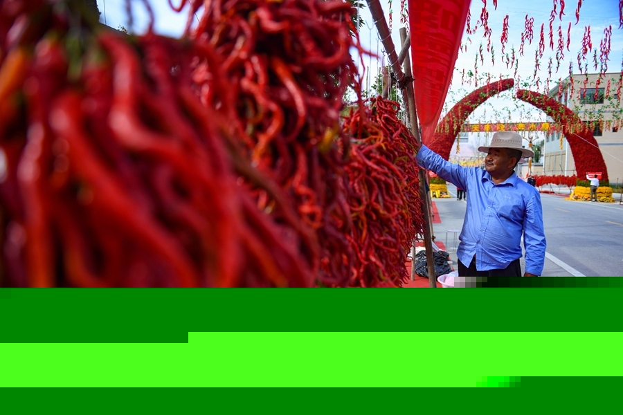農(nóng)戶在2020年慶祝中國(guó)農(nóng)民豐收節(jié)暨循化縣消費(fèi)扶貧“辣椒節(jié)”現(xiàn)場(chǎng)銷(xiāo)售線辣椒。(新華網(wǎng)潘彬彬 攝)