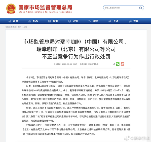 2020年9月18日,市場監管總局及上海、北京市場監管部門,對瑞幸咖啡(中國)有限公司、瑞幸咖啡(北京)有限公司及北京車行天下咨詢服務有限公司、北京神州優通科技發展有限公司、征者國際貿易(廈門)有限公司等45家涉案公司作出行政處罰決定,處罰金額共計6100萬元。