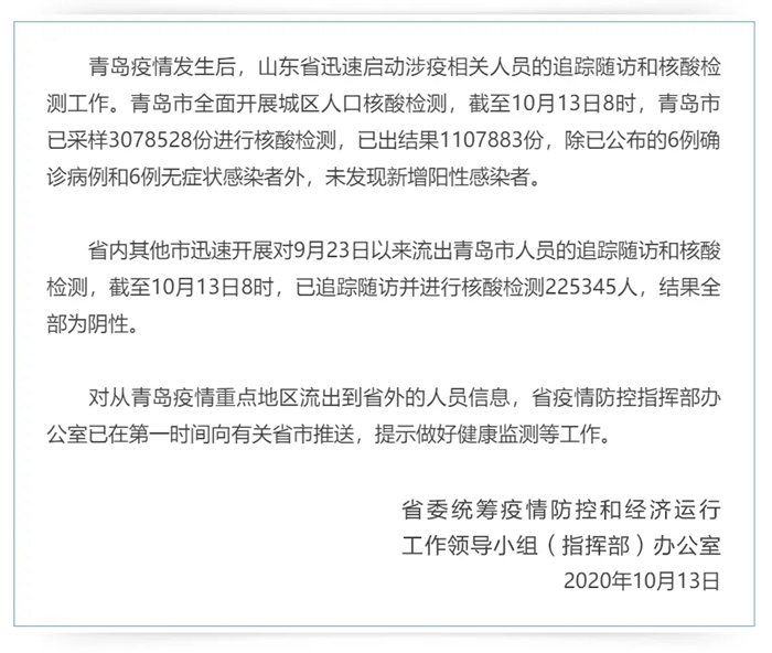山東省迅速開展青島疫情相關人員追蹤隨訪和核酸檢測工作