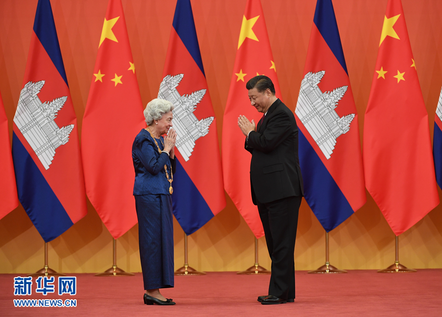 11月6日,國家主席習近平在北京人民大會堂為柬埔寨太后莫尼列舉行中華人民共和國“友誼勛章”頒授儀式。 新華社記者 張領 攝