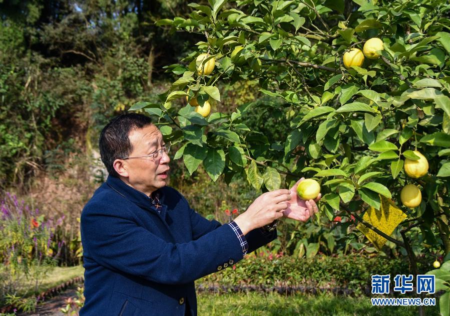 在四川省資陽(yáng)市安岳縣寶森檸檬小鎮(zhèn)世界檸檬品種博覽園,安岳縣檸檬產(chǎn)業(yè)發(fā)展中心主任田再澤在查看檸檬的長(zhǎng)勢(shì)情況(11月11日攝)。新華社記者 周相吉 攝
