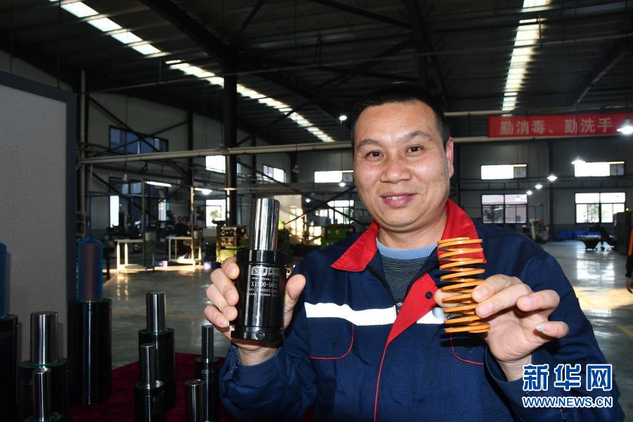 在四川省廣安市鄰水縣川渝合作高灘園區,四川欣悅精工科技有限公司管理部經理劉世華展示公司研發生產的新型彈簧和傳統螺旋彈簧(11月12日攝)。新華社記者 周相吉 攝
