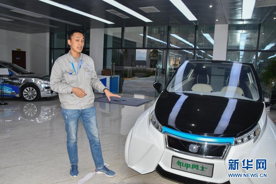 在四川省廣安市鄰水縣川渝合作高灘園區,四川瑞創汽車科技有限公司技術總監李效輝在介紹一款可原地旋轉和橫向移動的新型汽車(11月12日攝)。新華社記者 周相吉 攝